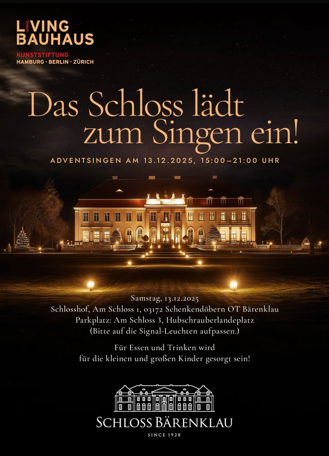 Die Living Bauhaus Kunststiftung SbR lädt gemeinsam mit zahlreichen Helfern aus Bärenklau zum 4. Weihnachtssingen auf dem Schlosshof ein. Dieses jährliche Ereignis bietet eine besondere Gelegenheit, die Vorweihnachtszeit mit Kunst, Musik und in Gemeinschaft zu bereichern.